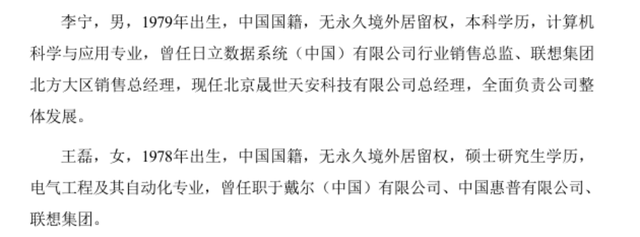 相比之下,入主安妮股份的晟世天安实控人李宁、王磊夫妇,则是典型的职业经理人背景。李宁曾担任日立数据系统销售总监,并执掌联想集团北方大区销售业务;王磊则拥有在戴尔、惠普、联想等企业的任职经历。